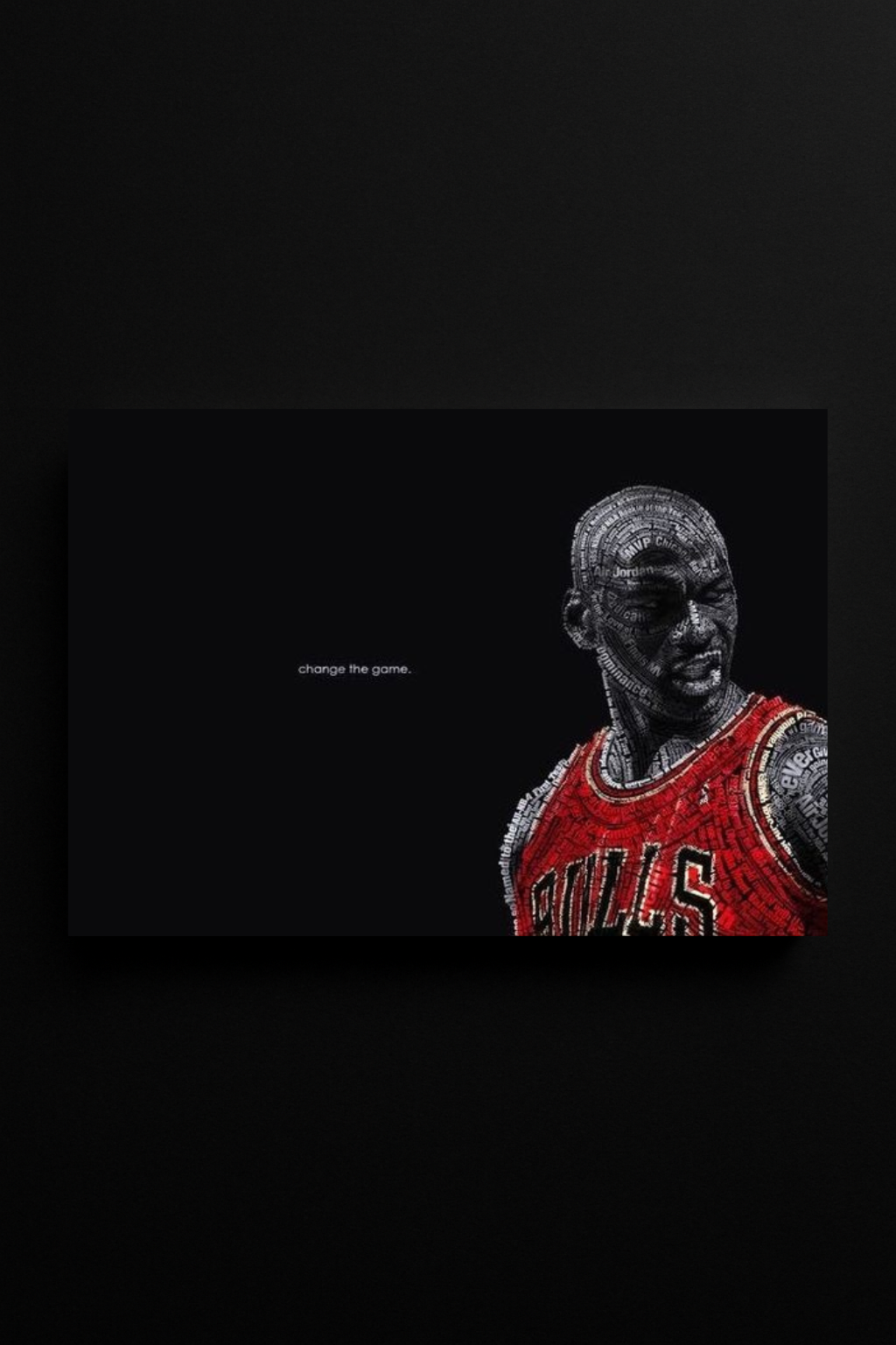 Pay homage to the man who changed the game. The “Change The Game” canvas depicts the figure of Michael Jordan with a unique artistic composition of words that describe his legendary career. The characteristic Bulls jersey in bright red contrast with the black background makes the work stand out, as does MJ himself.