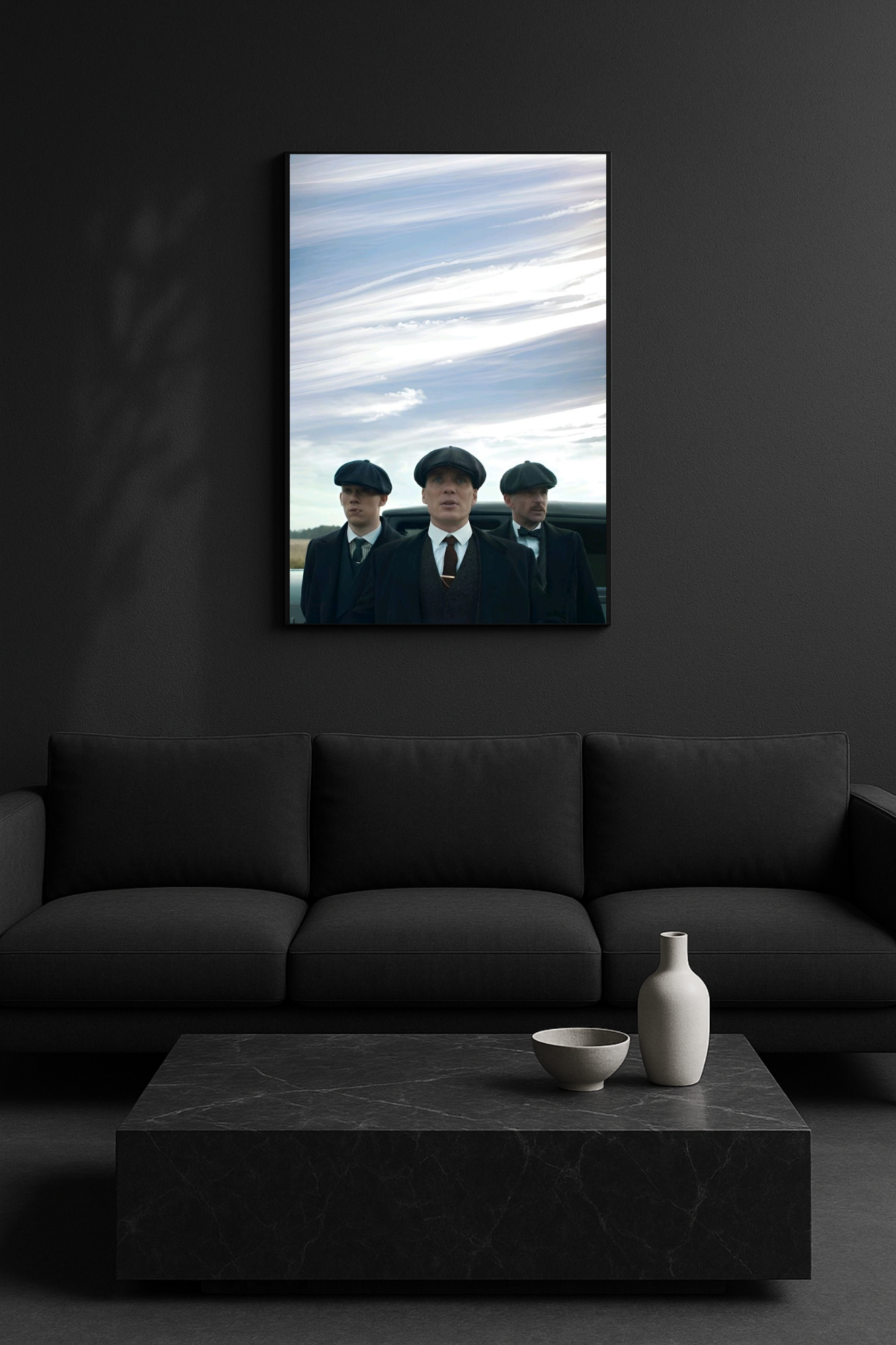 Ένα εμβληματικό στιγμιότυπο που αποτυπώνει την αποφασιστικότητα, το στυλ και το ακατέργαστο κύρος της οικογένειας Shelby. Με τον ουρανό να ανοίγει θεαματικά πίσω τους, το έργο αυτό συμβολίζει δύναμη, ενότητα και την αδιάκοπη πορεία προς την κορυφή.