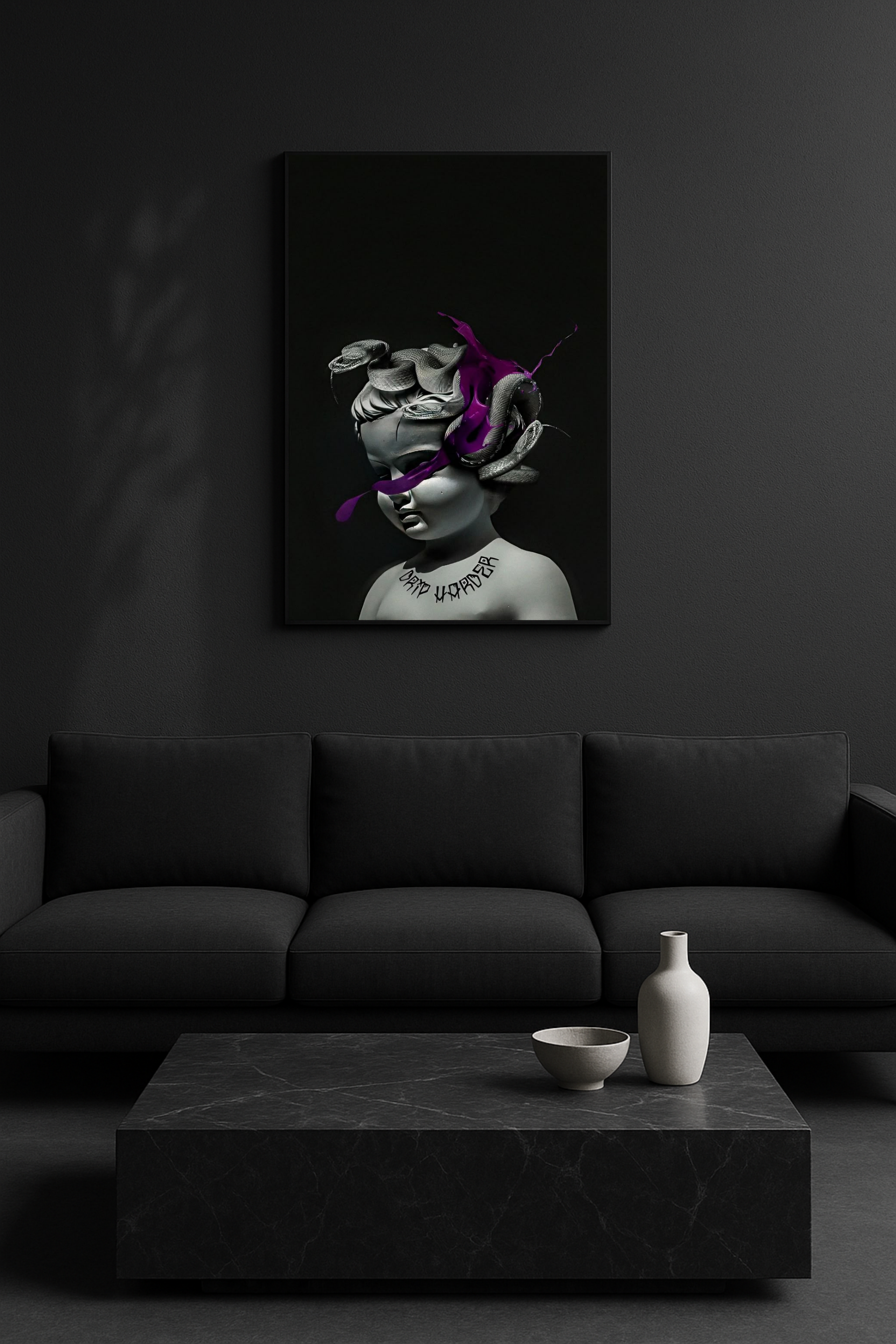 Ένα σκοτεινό αλλά εντυπωσιακό έργο τέχνης που συνδυάζει την αθωότητα ενός αγάλματος με την ωμή δύναμη των φιδιών και την ένταση του μωβ χρώματος. Το graffiti-style στοιχείο ολοκληρώνει την urban αισθητική, δημιουργώντας ένα statement κομμάτι που τραβάει όλα τα βλέμματα.