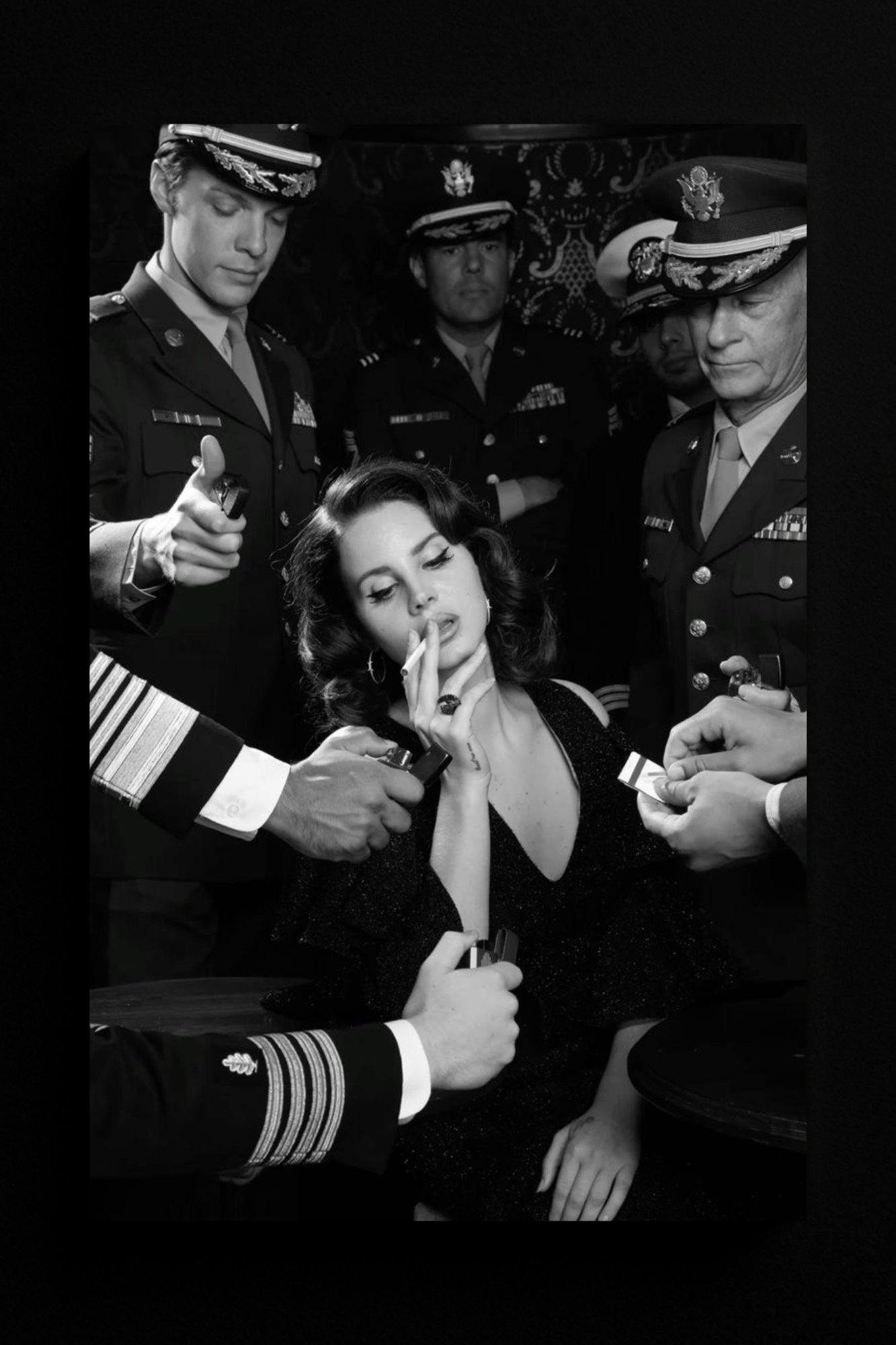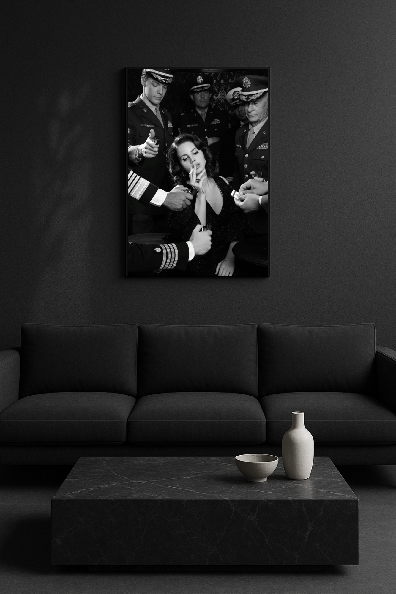 Μια εμβληματική σκηνή που αποπνέει μυστήριο, κύρος και ακαταμάχητη γοητεία. Η γυναίκα στο κέντρο της προσοχής, τυλιγμένη με αύρα εξουσίας και πολυτέλειας, περιστοιχίζεται από στρατιωτικές φιγούρες, δημιουργώντας μια κινηματογραφική αντίθεση δύναμης και κομψότητας.