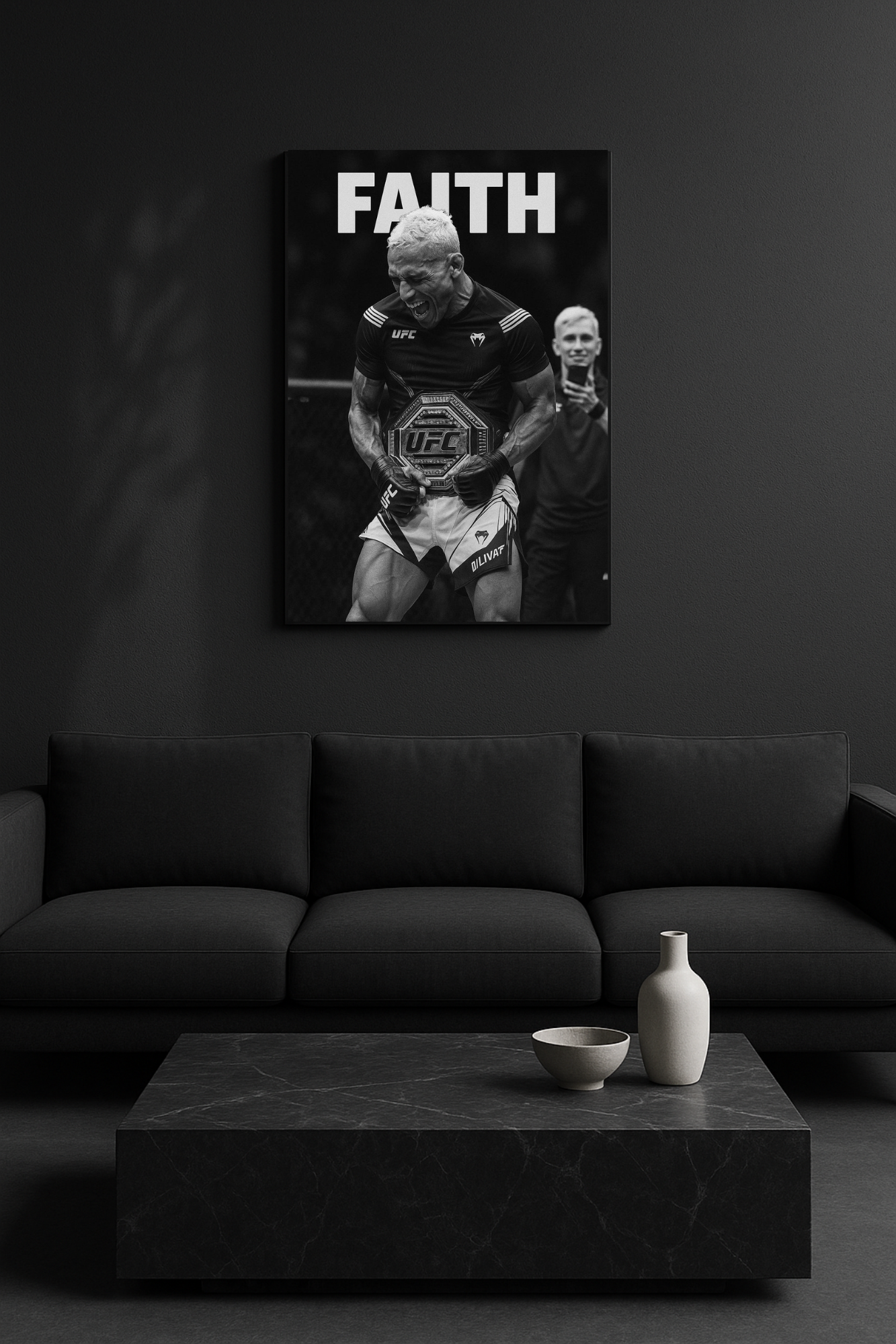 Η πίστη είναι η κινητήρια δύναμη κάθε πρωταθλητή. Αυτός ο καμβάς αποτυπώνει την απόλυτη στιγμή θριάμβου μέσα στο κλουβί, με το μήνυμα FAITH να υπενθυμίζει ότι όλα ξεκινούν από τη δύναμη του μυαλού και της καρδιάς.