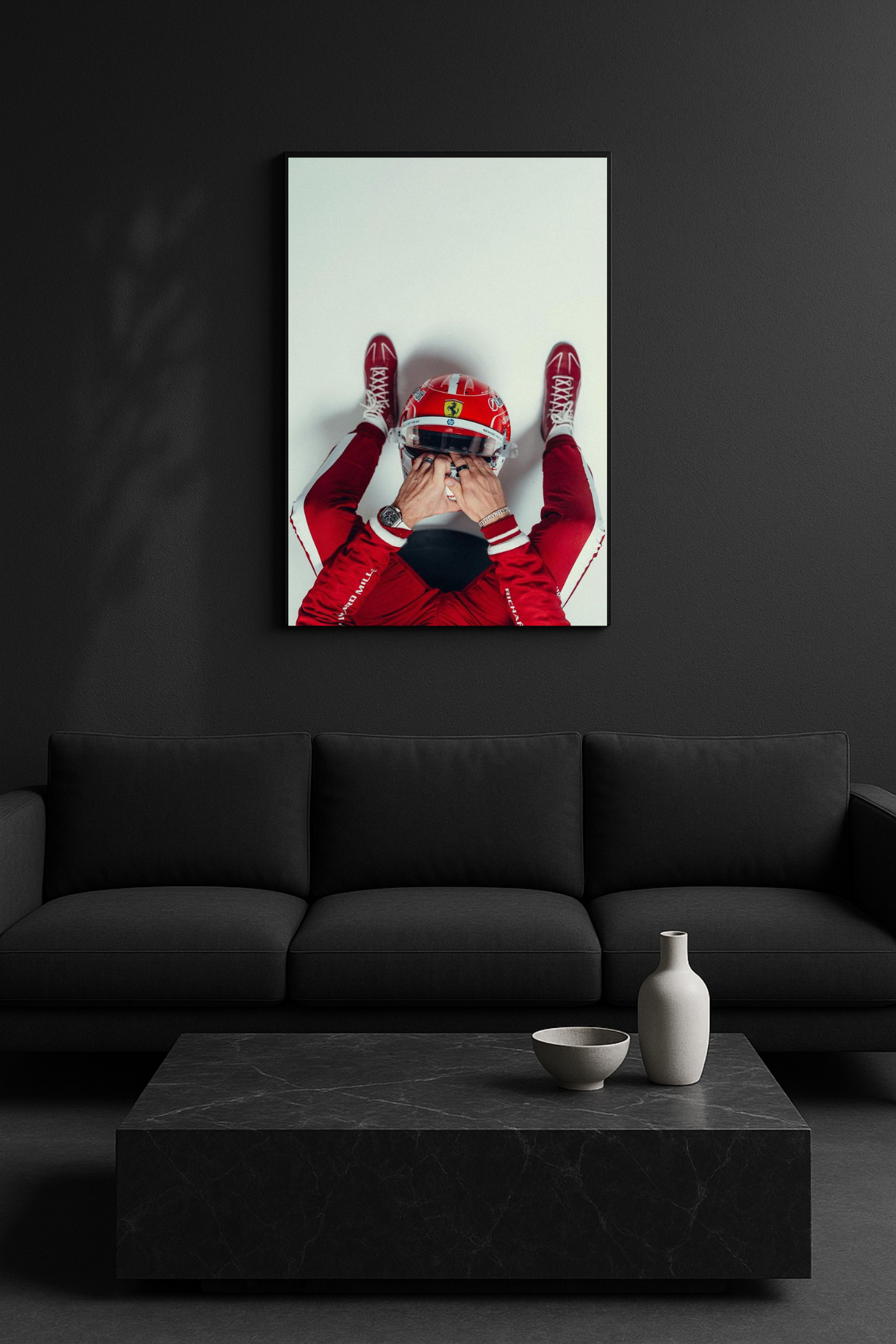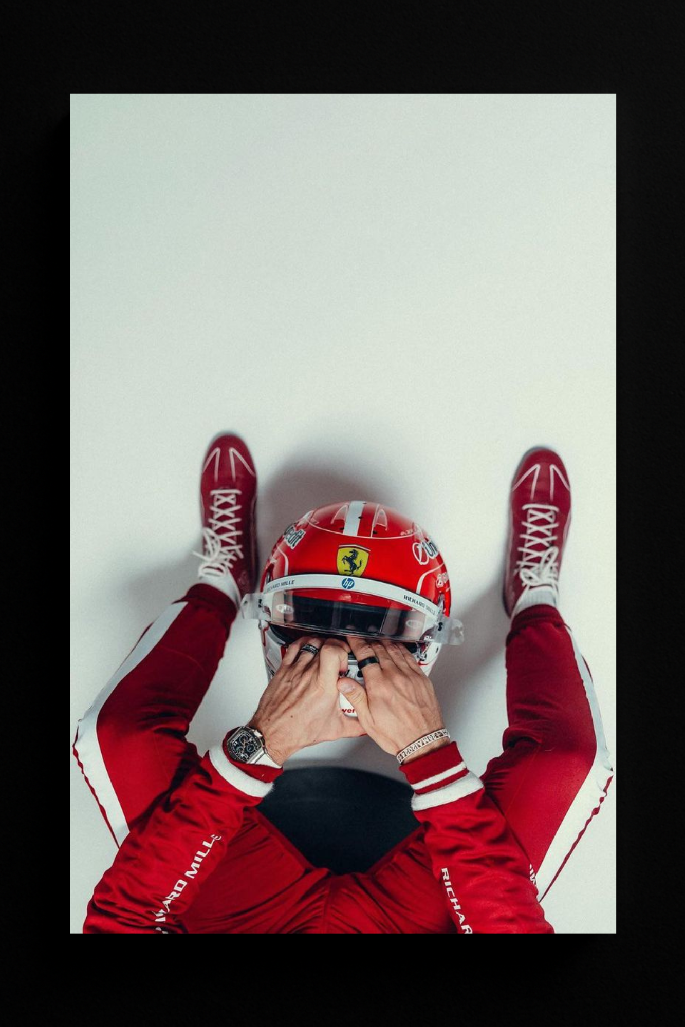 Ένα δυναμικό στιγμιότυπο που αποτυπώνει την αφοσίωση, την ένταση και το πάθος του μηχανοκίνητου αθλητισμού. Ο οδηγός της Ferrari ετοιμάζεται για τη μάχη της πίστας, δένοντας το κράνος του με απόλυτη συγκέντρωση, σε μια εικόνα που αποπνέει ταχύτητα, δύναμη και αποφασιστικότητα.