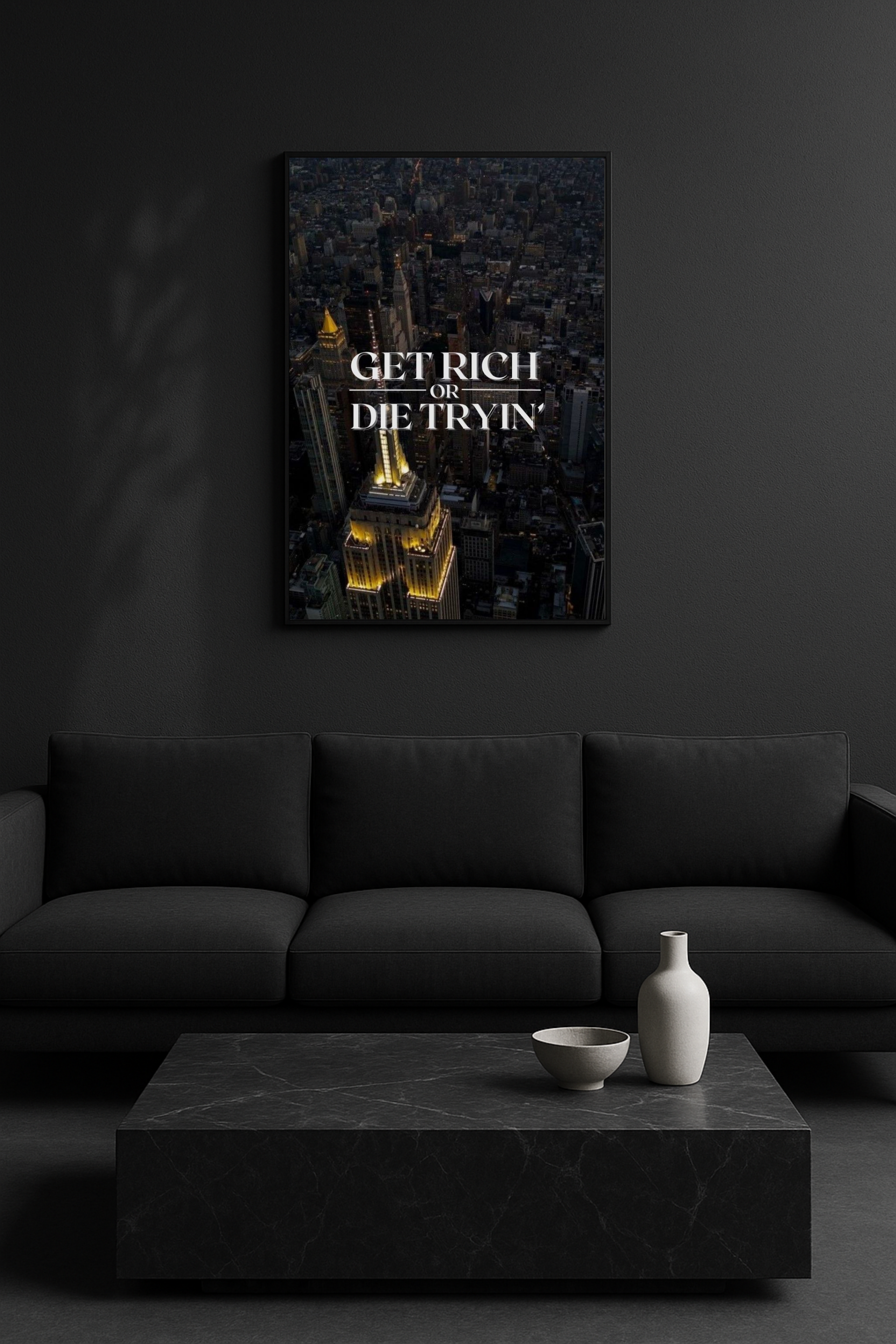 Ένα αστικό αριστούργημα με το επιβλητικό skyline της Νέας Υόρκης, φωτισμένο από τα χρυσά φώτα των ουρανοξυστών. Το τολμηρό μήνυμα “Get Rich or Die Tryin’” ξεχωρίζει στο κέντρο, εμπνέοντας αποφασιστικότητα και ασταμάτητη προσπάθεια για την κορυφή.