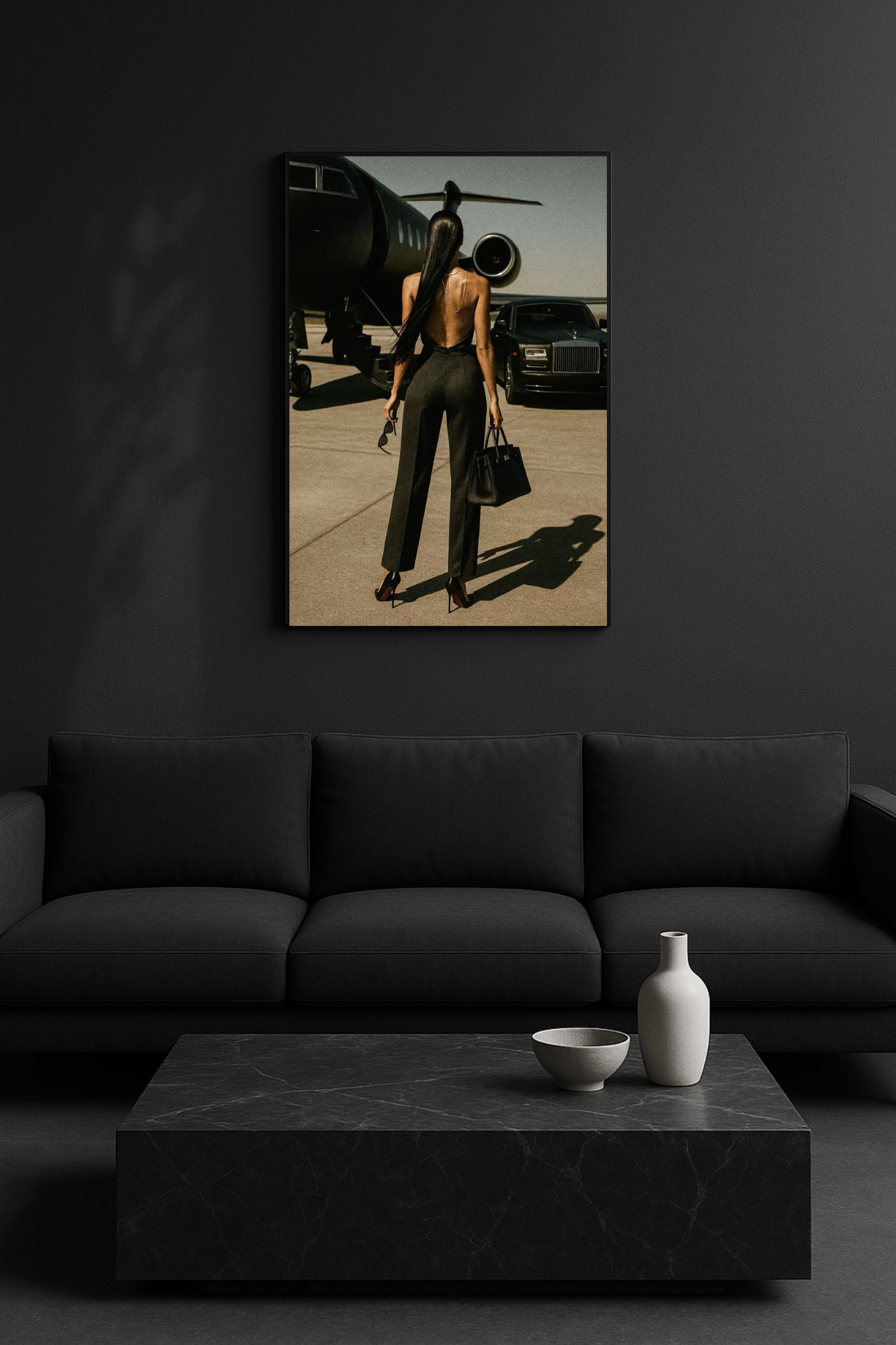 Μια εικόνα που συμβολίζει το απόλυτο ταξίδι στην επιτυχία. Μια δυναμική γυναικεία φιγούρα με κομψότητα και αυτοπεποίθηση κατευθύνεται προς το ιδιωτικό jet, ενώ στο πλάι δεσπόζει η Rolls-Royce – σύμβολα πολυτέλειας και ανώτερης ζωής. Ένα καμβάς που δεν είναι απλώς διακόσμηση, αλλά υπενθύμιση φιλοδοξίας και ελευθερίας.