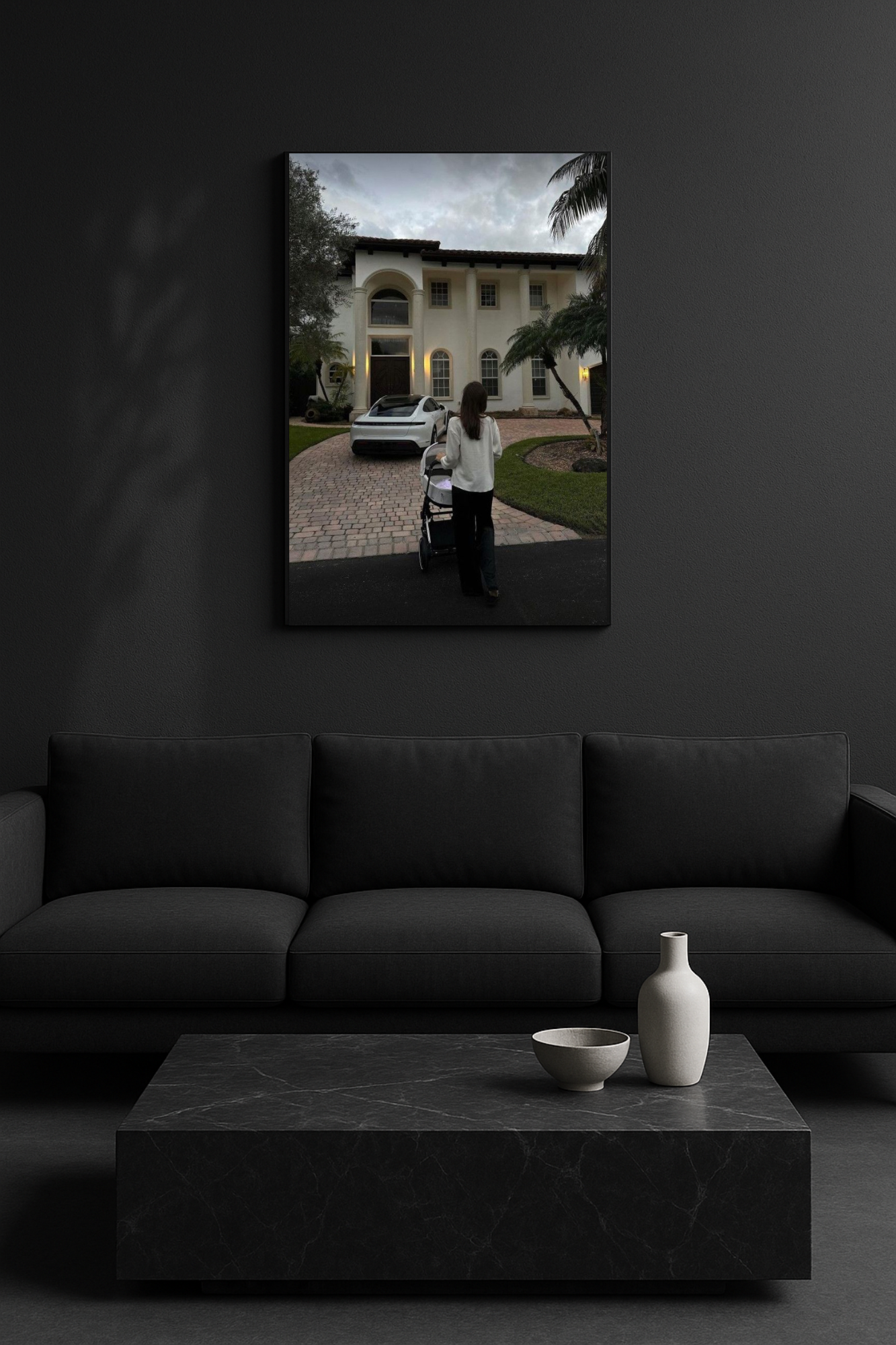 Η εικόνα που αποτυπώνει το όνειρο: μια μητέρα με το παιδί της μπαίνει σε μια πολυτελή βίλα, με φόντο ένα λευκό supercar. Ένας καμβάς που συμβολίζει την επιτυχία, την οικογένεια και την επιδίωξη ενός lifestyle γεμάτου άνεση και όραμα.