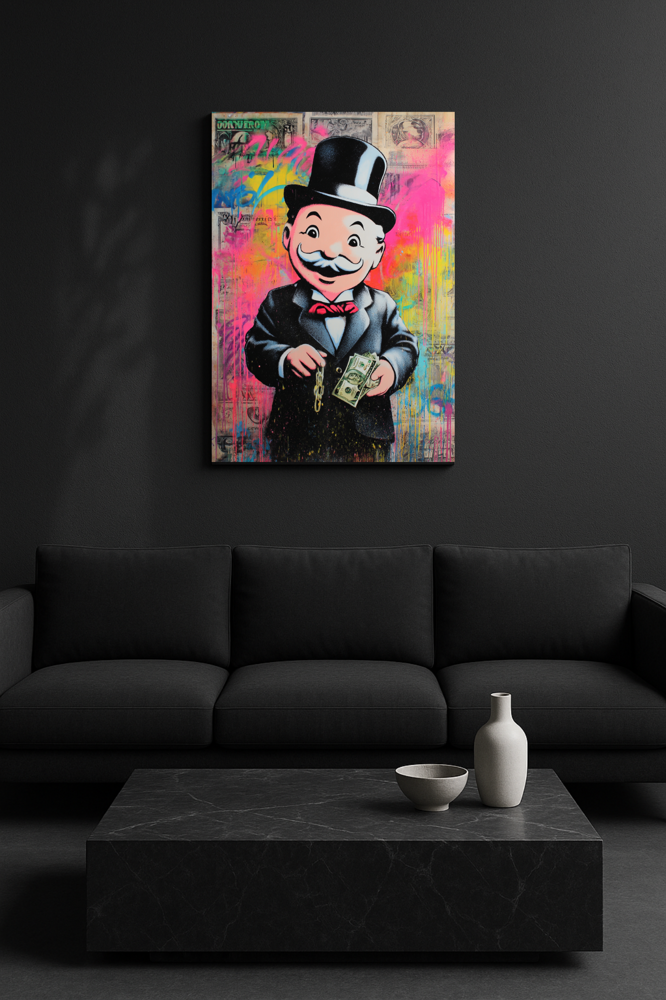 Ένα έργο που συνδυάζει pop-art αισθητική με street-style graffiti. Ο εμβληματικός χαρακτήρας του Monopoly ζωντανεύει πάνω σε καμβά, κρατώντας χρήματα και αλυσίδα, με πολύχρωμο φόντο που εκφράζει την έννοια της επιτυχίας, του πλούτου και της χαράς της δημιουργίας. Ένα statement κομμάτι που θα γεμίσει ενέργεια και στυλ τον χώρο σου.