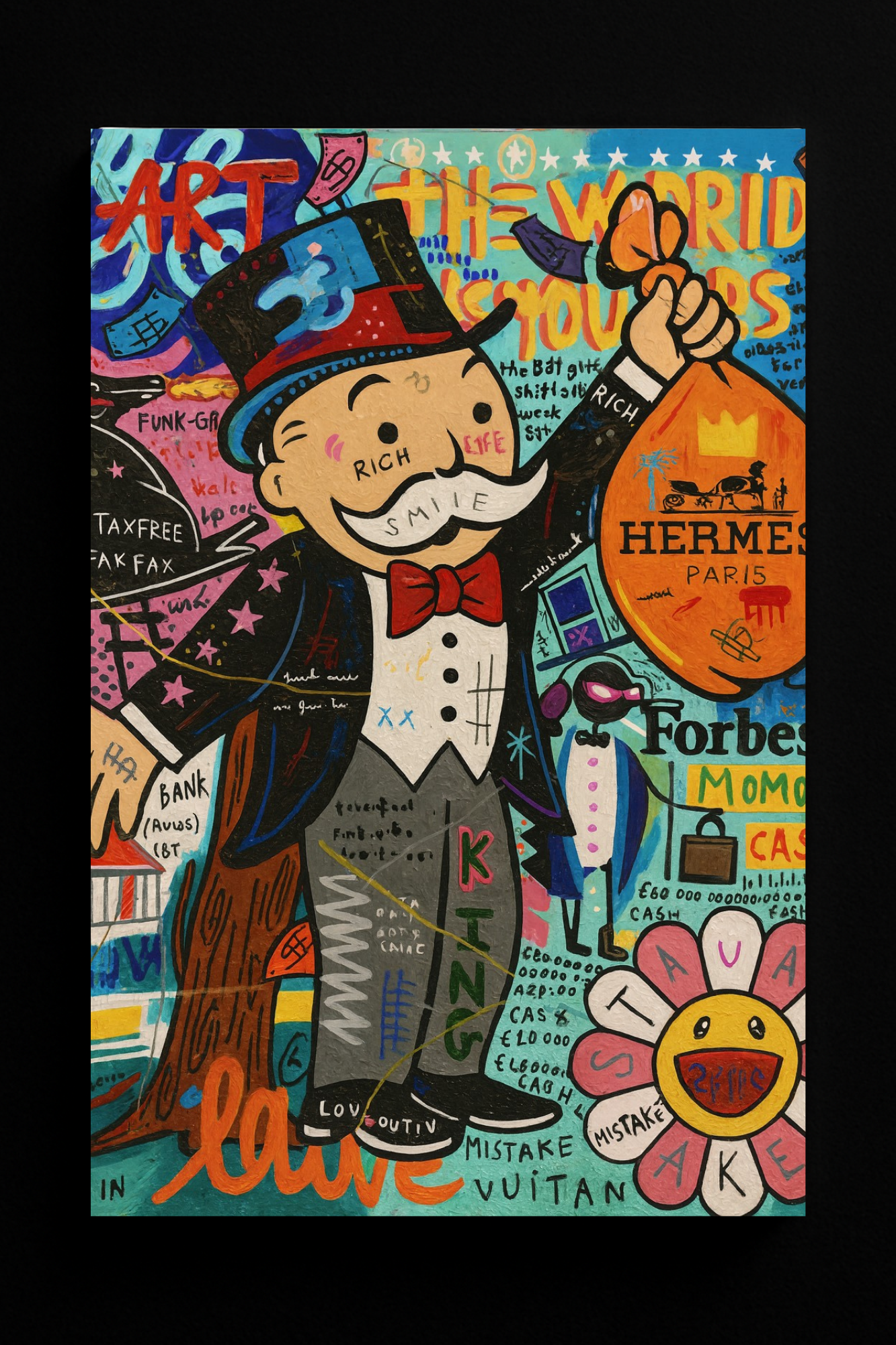 Ένα εκρηκτικό μίγμα τέχνης, πλούτου και ειρωνείας. Ο iconic Mr. Monopoly κρατά μια τσάντα Hermès, περιτριγυρισμένος από graffiti — όλα με μια δόση χιούμορ και πολυτελούς αναρχίας.