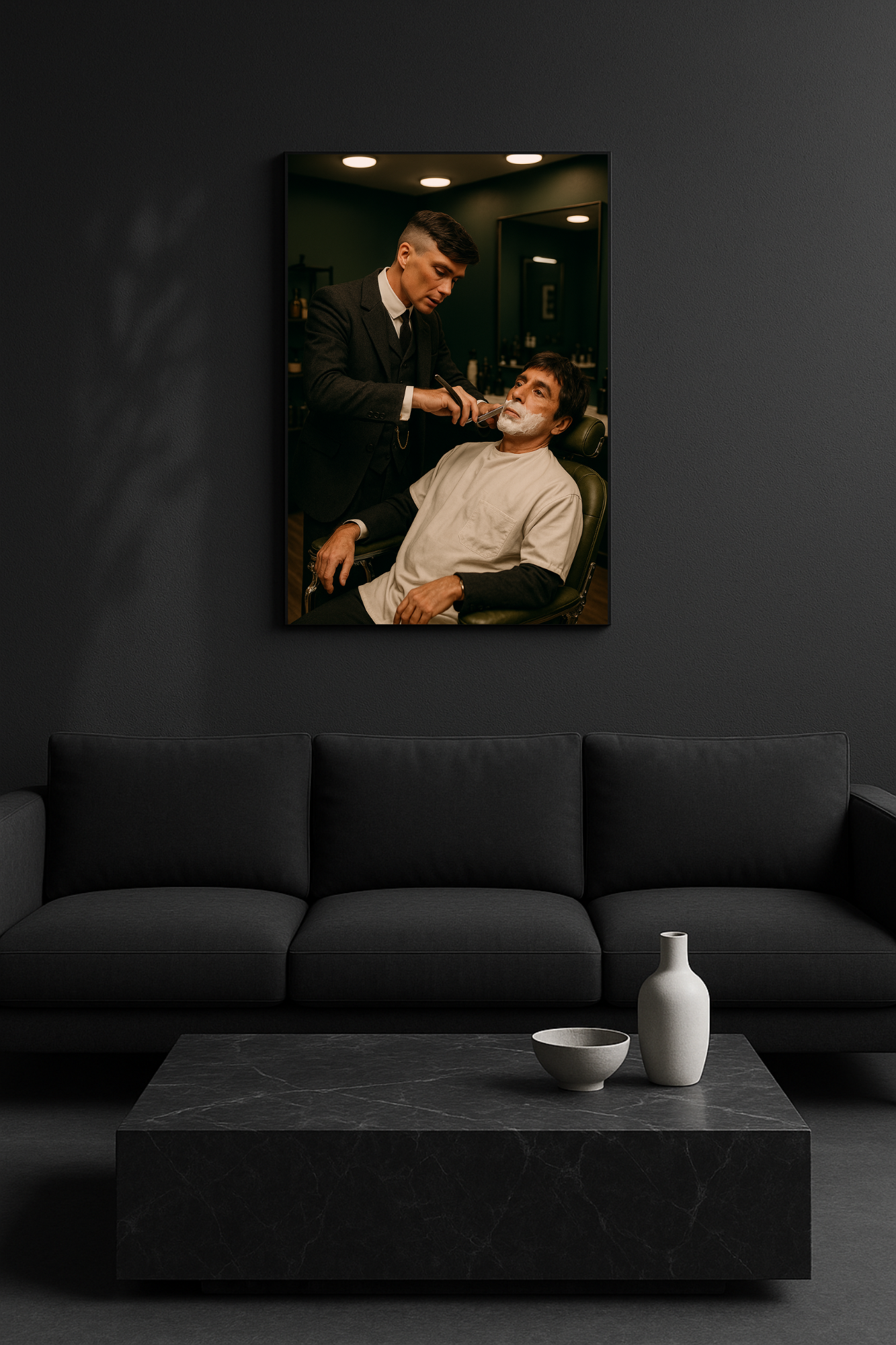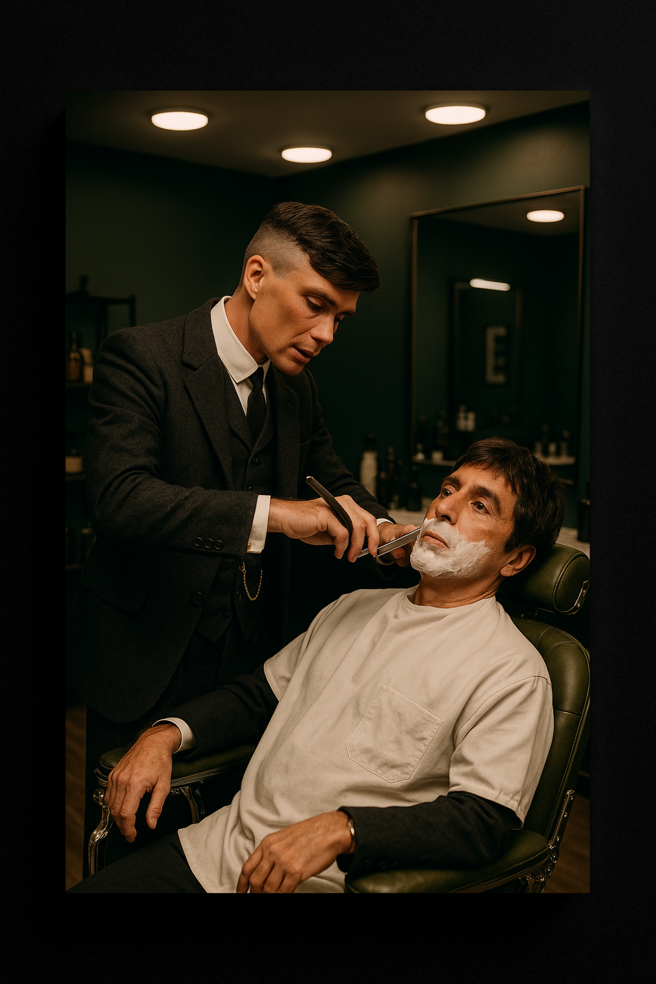 Δύο θρυλικές φιγούρες της pop culture συναντιούνται σε μια σκηνή με ένταση, κύρος και ατμόσφαιρα εξουσίας. Ο Tommy Shelby, με την ψυχρή του αποφασιστικότητα, ξυρίζει τον Tony Montana σε μια εικόνα που αποπνέει εμπιστοσύνη, επικινδυνότητα και αμοιβαίο σεβασμό.