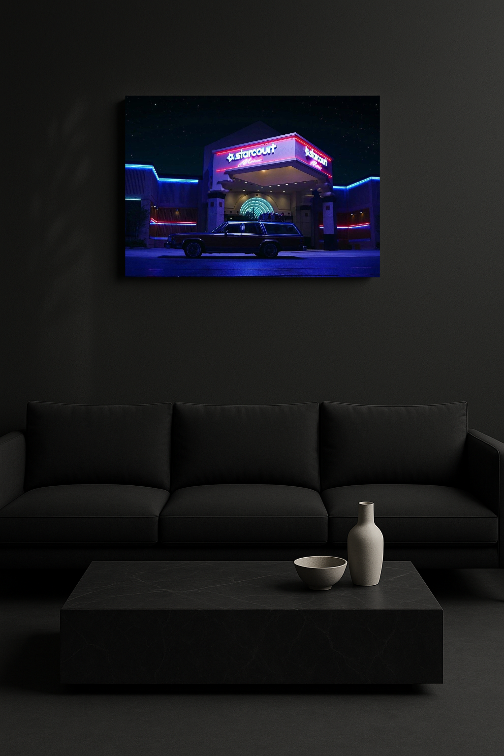 Ένα εμβληματικό καρέ από το Stranger Things, με το Starcourt Mall φωτισμένο στα neon φώτα των 80’s. Το σκοτεινό σκηνικό, το vintage αυτοκίνητο και η ηλεκτρισμένη ατμόσφαιρα δημιουργούν έναν καμβά που αποπνέει νοσταλγία, μυστήριο και καθαρό cinematic vibe.
