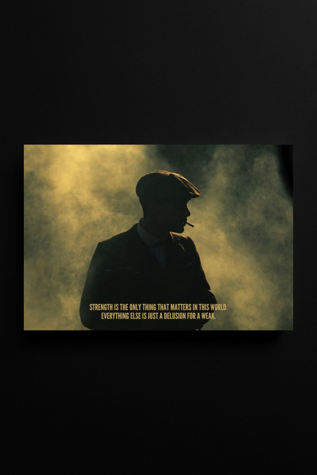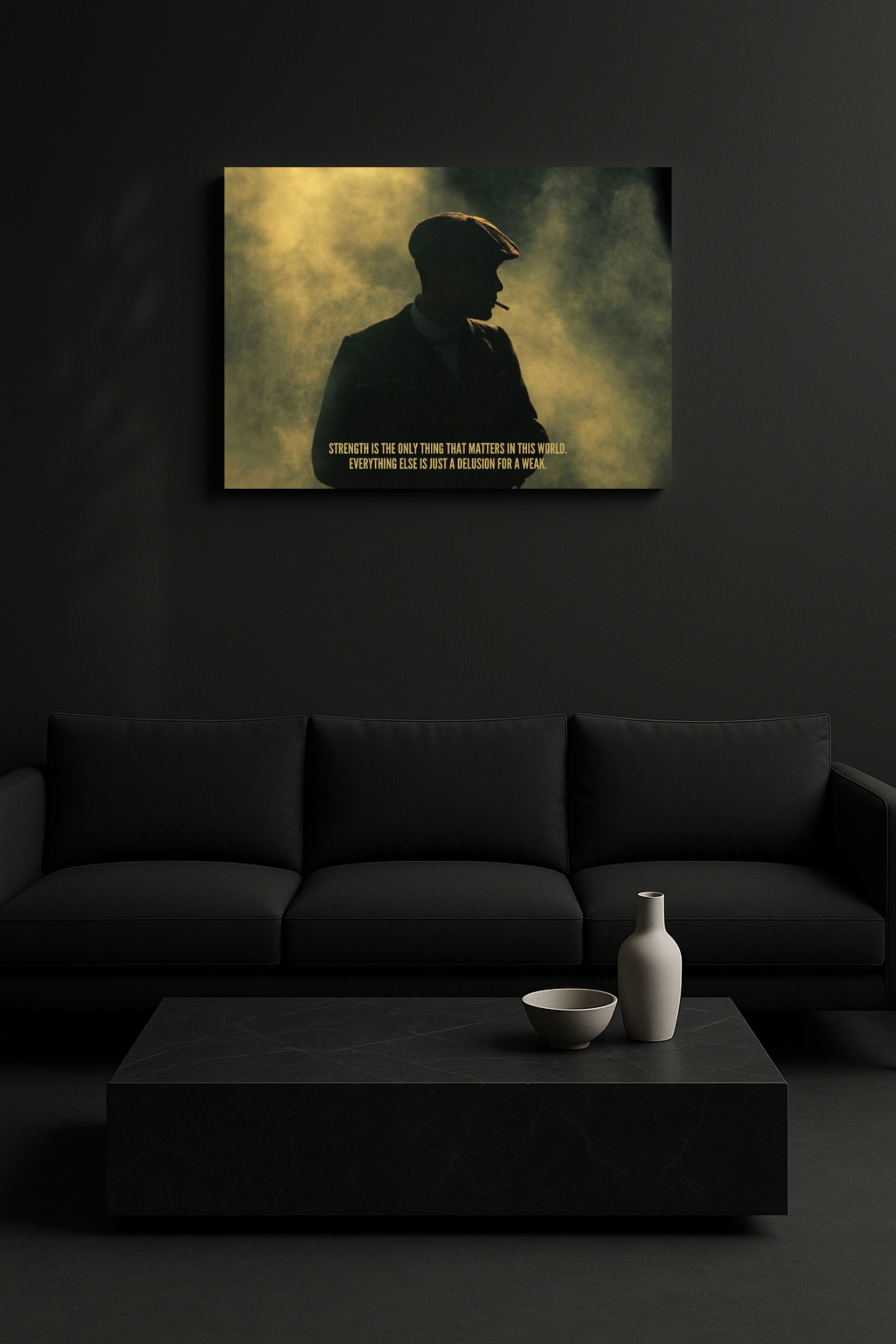 Ένα σκοτεινό, κινηματογραφικό έργο εμπνευσμένο από τον εμβληματικό κόσμο των Peaky Blinders. Ο καμβάς “Strength Matters” απεικονίζει τον Thomas Shelby μέσα σε καπνό και σκιές, με τη φράση “Strength is the only thing that matters in this world. Everything else is just a delusion for a weak.” να κυριαρχεί στο φόντο. Μια δήλωση δύναμης, αποφασιστικότητας και αφοσίωσης στο σκοπό.
