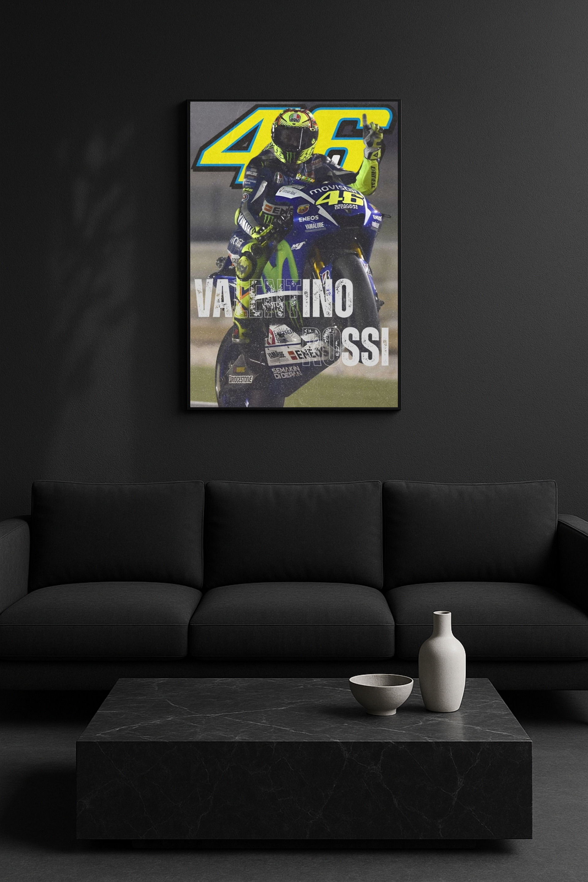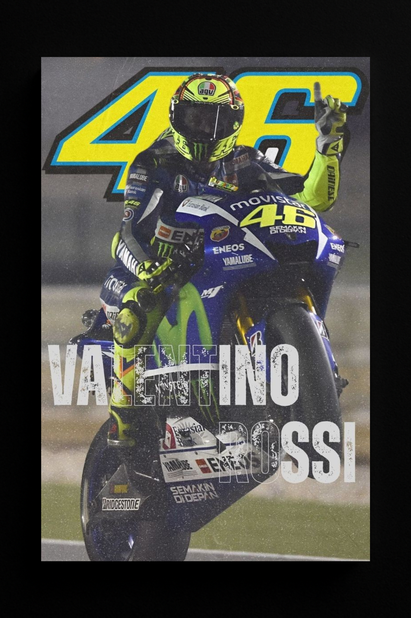 Το απόλυτο tribute στον θρύλο του MotoGP. Ο Valentino Rossi με το #46 σε πρώτο πλάνο, αιχμαλωτισμένος σε μια δυναμική στιγμή πάνω στη Yamaha του. Ένα έργο γεμάτο ταχύτητα, ενέργεια και σεβασμό για τον GOAT των δύο τροχών.