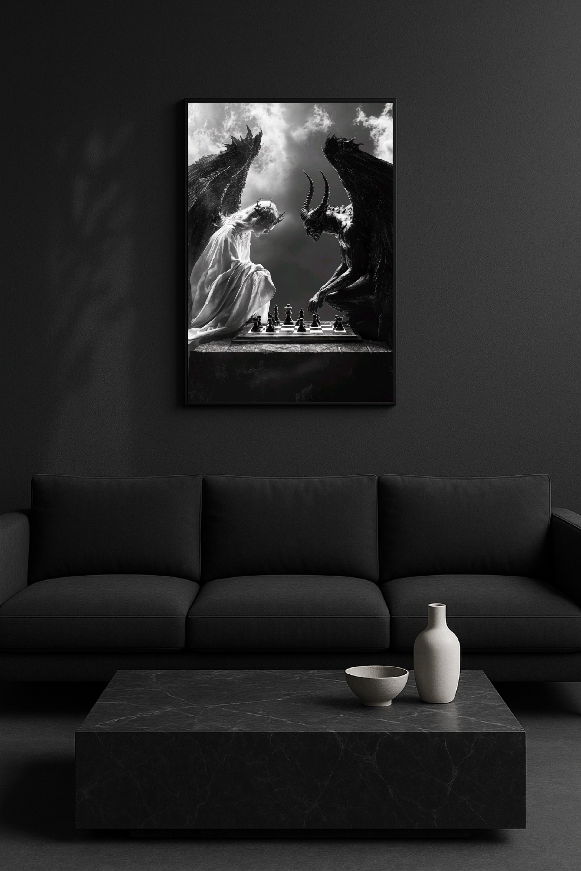 Ένα αριστουργηματικό έργο που αποτυπώνει την αιώνια μάχη ανάμεσα στο φως και το σκοτάδι. Άγγελος και δαίμονας κάθονται αντιμέτωποι σε μια σκακιέρα, με κάθε κίνηση να συμβολίζει τις επιλογές, τις συγκρούσεις και τις ισορροπίες της ζωής. Η μονόχρωμη παλέτα δίνει δραματικό και κινηματογραφικό ύφος, κάνοντας το έργο να ξεχωρίζει με την ένταση και το βάθος του.