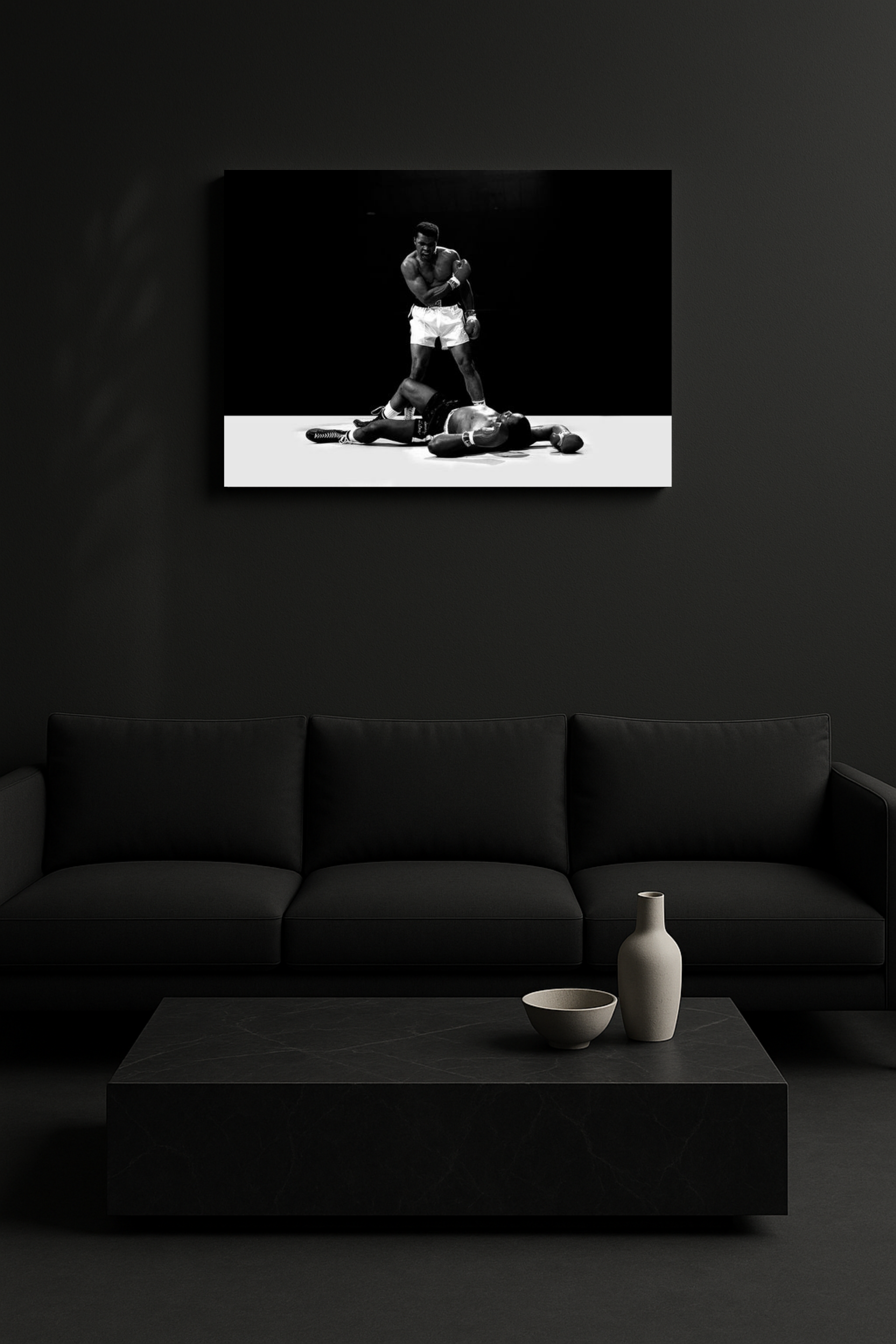 Η εμβληματική στιγμή του Muhammad Ali που σφράγισε την ιστορία της πυγμαχίας. Ο Ali, σε ένα από τα πιο διάσημα knockouts όλων των εποχών, στέκεται θριαμβευτής πάνω από τον αντίπαλό του, αποτυπωμένος σε δραματικό ασπρόμαυρο κάδρο που αποπνέει δύναμη, πάθος και ανίκητο πνεύμα.