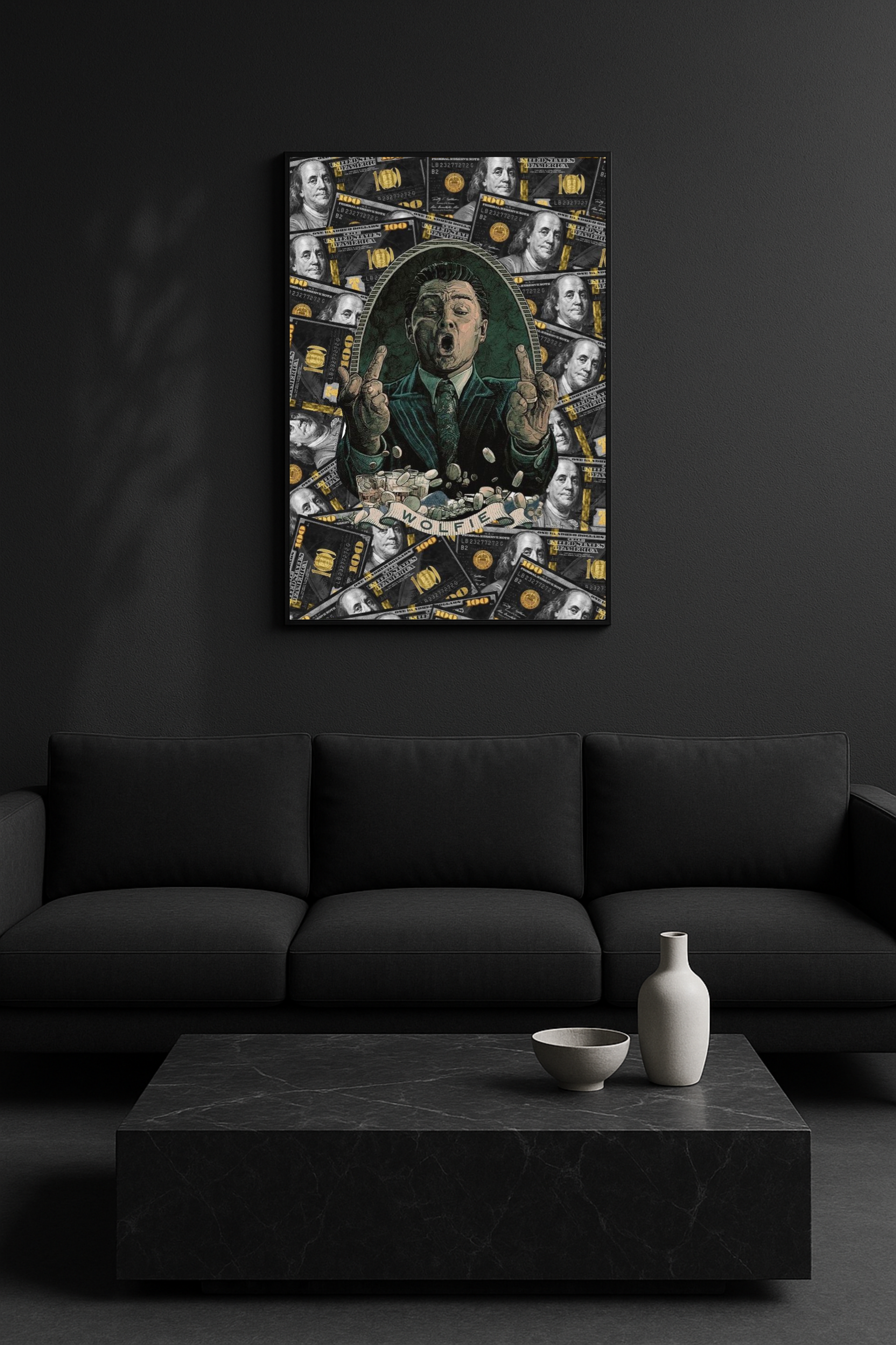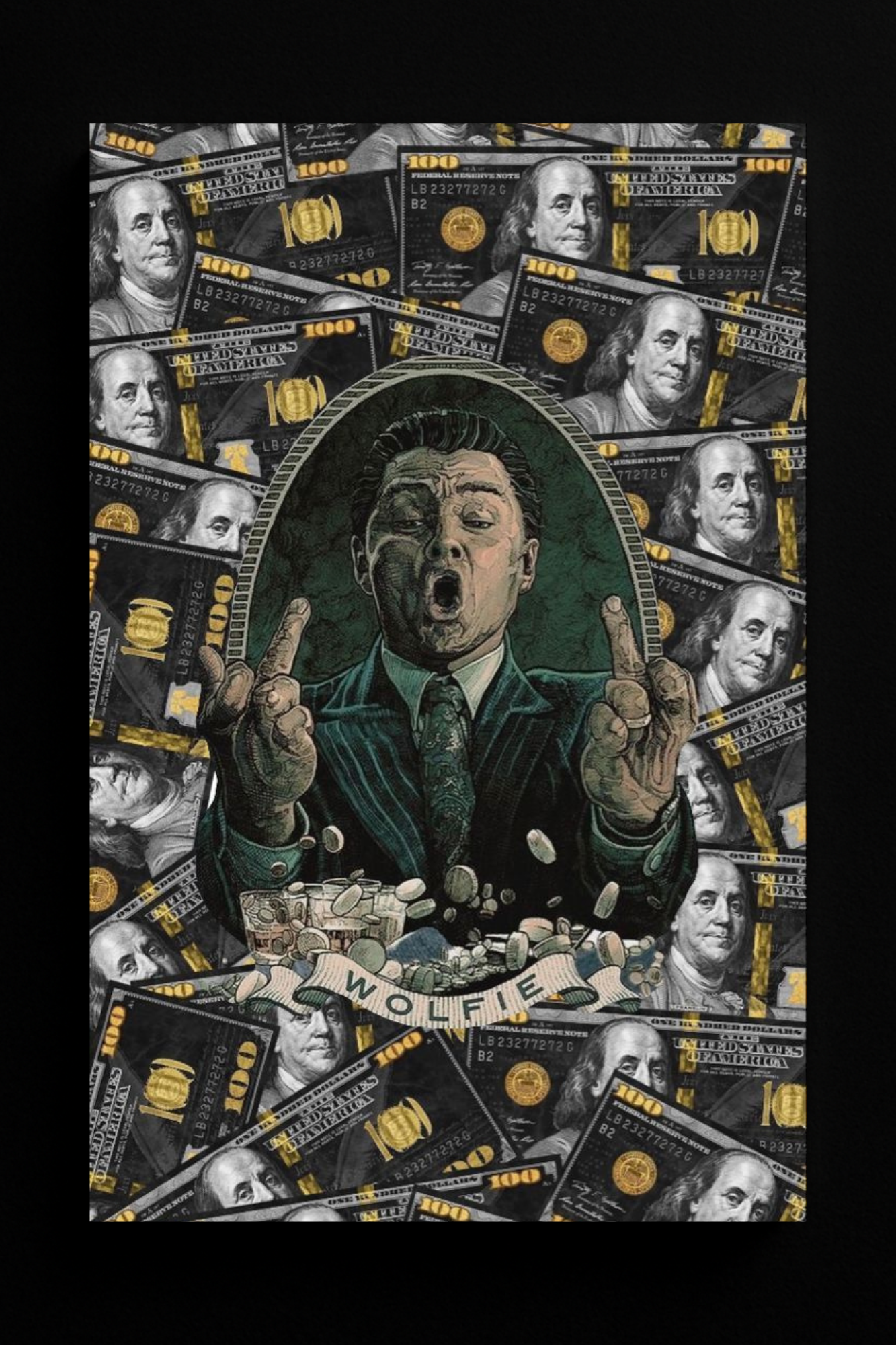 Ένας εκρηκτικός καμβάς εμπνευσμένος από τον Wolf of Wall Street, που αποτυπώνει την απόλυτη τρέλα του Jordan Belfort μέσα σε ένα χαοτικό σκηνικό με χαρτονομίσματα και έντονα χρώματα. Η προκλητική του χειρονομία και το δυναμικό background γεμάτο δολάρια δημιουργούν μια εικόνα που συμβολίζει απληστία, δύναμη και την ασταμάτητη επιθυμία για πλούτο.