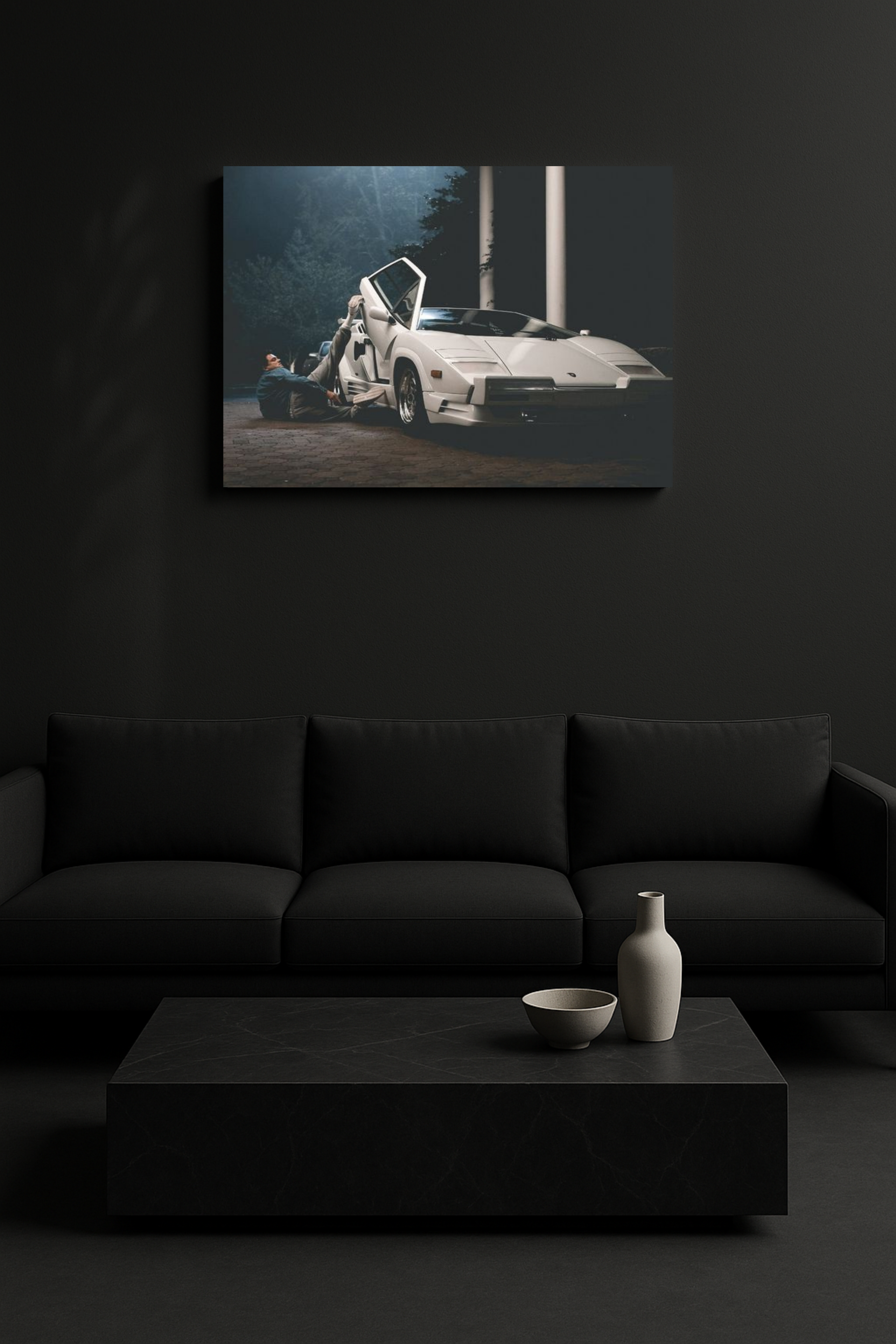 Ένα εμβληματικό καρέ εμπνευσμένο από την πιο ξέφρενη σκηνή του The Wolf of Wall Street. Η λευκή Lamborghini Countach γίνεται το απόλυτο σύμβολο υπερβολής, επιτυχίας και πολυτέλειας. Ο καμβάς αποτυπώνει τη στιγμή με κινηματογραφική ένταση και dark-luxury αισθητική — ένα έργο που μεταφέρει το vibe του “money, power & chaos” στον χώρο σου.
